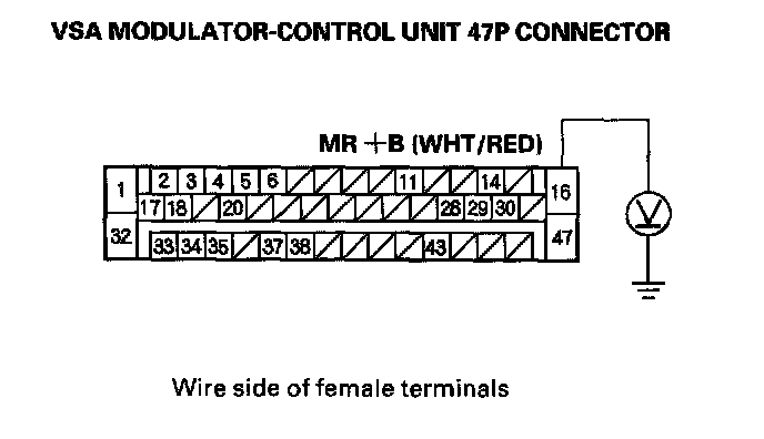 3. Measure the voltage between the VSA modulator control unit 47P connector terminal No. 16 and body ground.