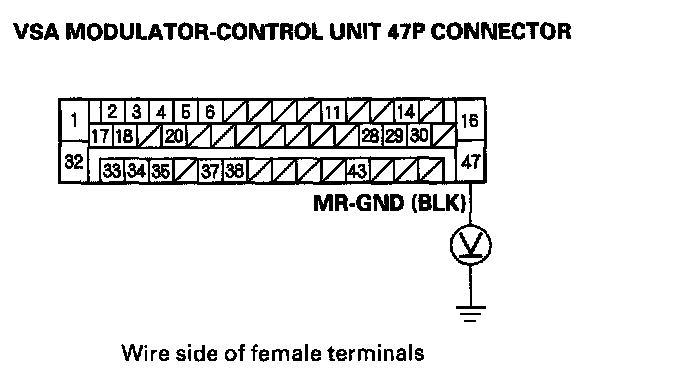 6. Measure the voltage between the VSA modulator control unit 47P connector terminal No. 47 and body ground.