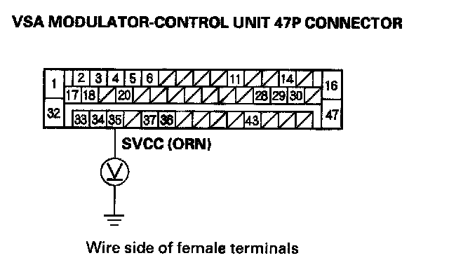 3. Measure the voltage between the VSA modulator control unit 47P connector terminal No. 35 and body ground.