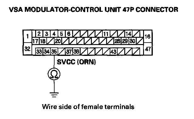 4. Check for continuity between the VSA modulator control unit 47P connector terminal No. 35 and body ground.