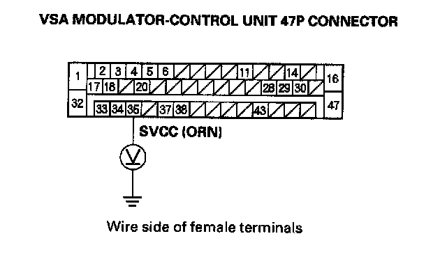 8. Measure the voltage between the VSA modulator control unit 47P connector terminal No. 35 and body ground.