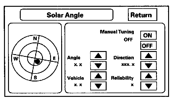 This screen is used to graphically display the sun's position as determined by GPS. The navigation system uses the sun's angle, along with the sunlight sensor to control the driver/passenger A/C air flow. The heat that must be removed by the A/C unit varies, depending on the angle of the sun entering the vehicle. This screen is for factory use only, and should not be adjusted.