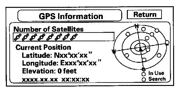 GPS InformationThis screen shows the current status of GPS reception. The circular diagram shows the current location of the GPS satellites {yellow dots) as they would appear in the sky. The outer circle represents the horizon (0 degrees elevation). The middle and inner circles represents 30 and 60 degrees respectively. The very center of the diagram (90 degrees elevation) is directly overhead. Naturally, nearby obstructions, like tall buildings will block satellites in that direction. That is why it is necessary to be in an open area to effectively troubleshoot GPS reception issues. There are always 24 "active" GPS satellites in orbit. Because satellites fail, and have to be removed from service, spares always parked in orbit, ready to be activated. This is why the PRN (satellite ID number) can be greater than 24.