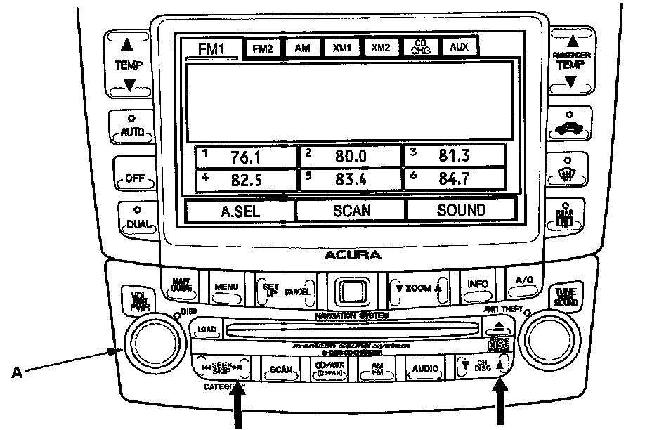 3. Push and hold the "SEEK SKIP" and "CH DISC" buttons. While holding the buttons, push the "VOL push PWR" knob (A) to ON. Release the buttons and the self-diagnostic function will begin.