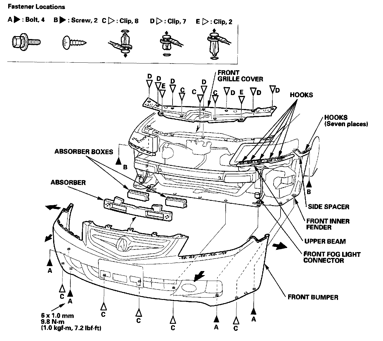 - Make sure the front bumper engages the hooks of the side spacers and upper beams on both sides securely.
