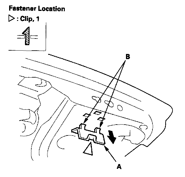 3. Detach the clip and pivot the trunk lid handle (A) on the hooks (B), then remove the trunk lid handle.