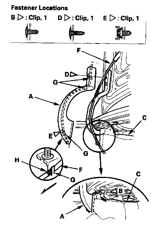 1. Remove the clip (B), then pull back the trunk-side trim panel (C) as needed.