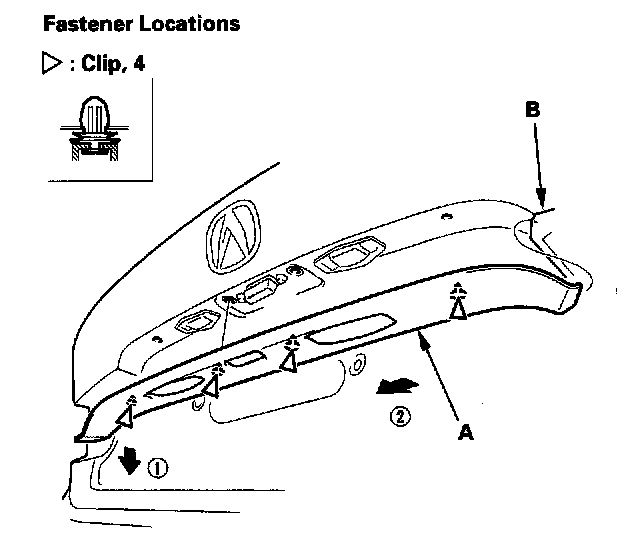 2. Detach the clips, and on both sides of the rear license trim (A), release the edge of the trim from the inner taillight (B), then remove the trim. Take care not to scratch the trunk lid.