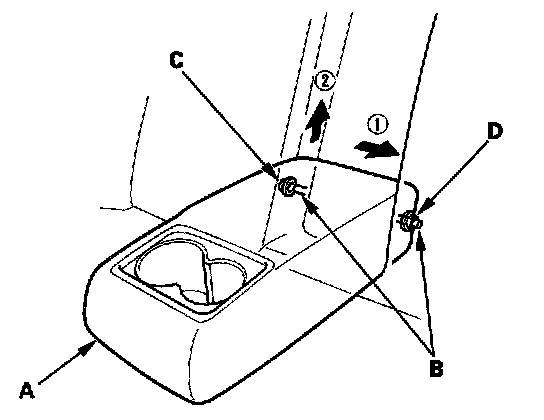 2. Remove the pivot shaft (B) from the collar (C) on the passenger's side of the vehicle by pulling up on the armrest, and remove the pivot shaft from the collar (D) by pulling up on the armrest.