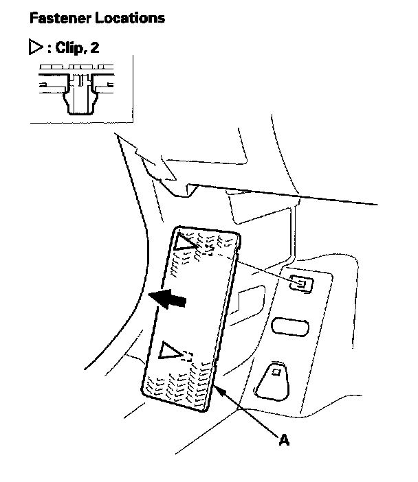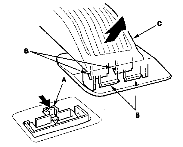 10. Remove the floor mat holders (A) from the driver's side, and release the clip (B) from middle of the carpet (C).