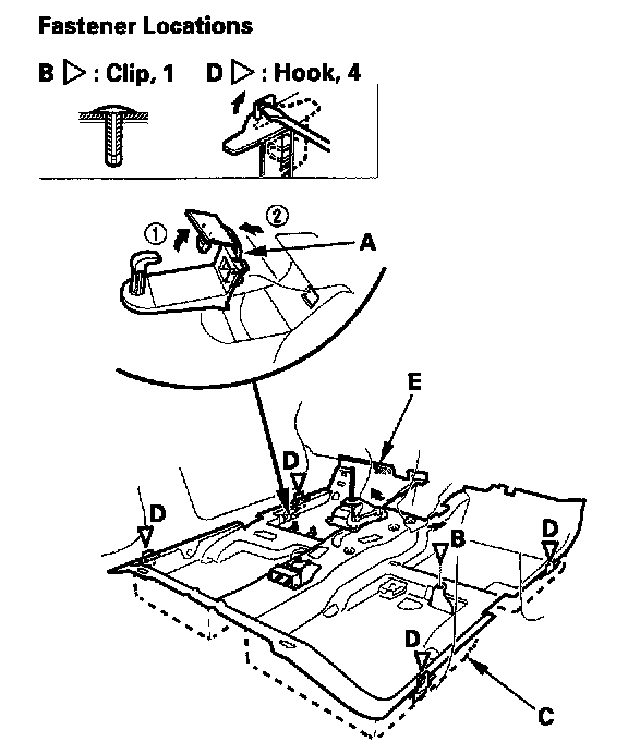 11. Release the hooks (D) with a flat-tip screwdriver by pushing the screwdriver toward the door, then lift upwards. Pull the fastener (E) out, then remove the carpet.