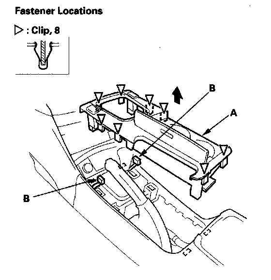 2. Starting towards the front of the vehicle detach the clips by pulling the center console panel (A) up If equipped, disconnect the seat heater switch connectors (B)