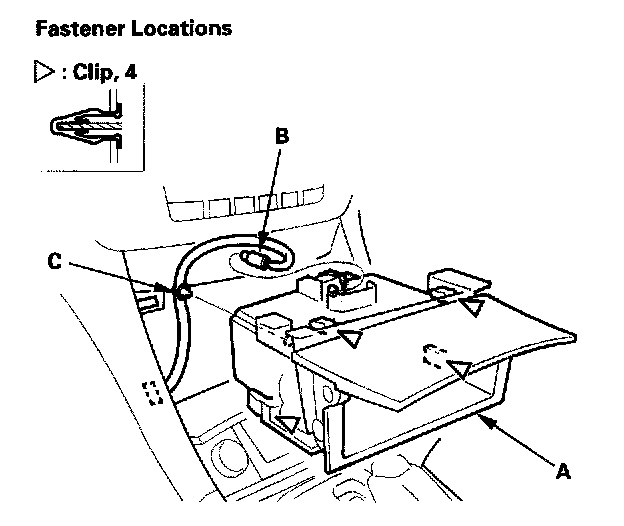 4. Remove the screws, disconnect the front accessory power socket connector (A) and detach the harness clip (B), then remove the center lower pocket (C)