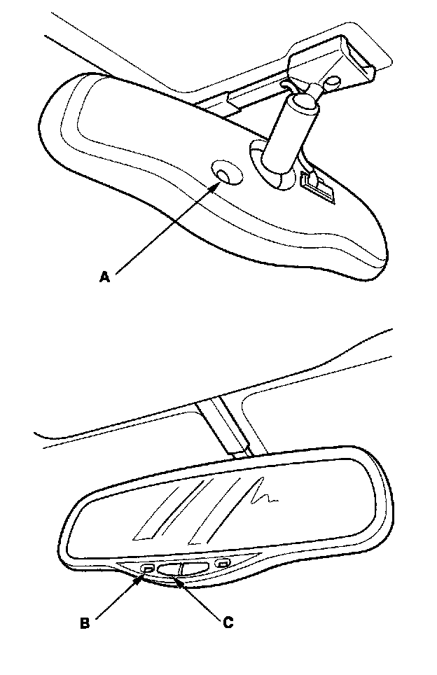 System DescriptionThe automatic dimming inside mirror has a front-facing lux level sensor {A), a rear-facing lux level sensor (B), and a control unit. The control unit receives signals from each sensor. Based on the difference between the two lux levels (the light outside the vehicle and the light from the headlights of the other vehicle, etc.), the control unit controls the electro-chromic gel to reduce the glare. This dimming function is canceled when the transmission is in reverse, or when the automatic dimming off switch (C) is turned OFF.