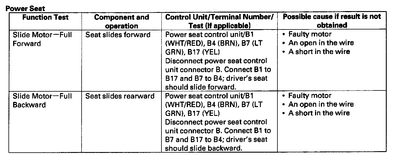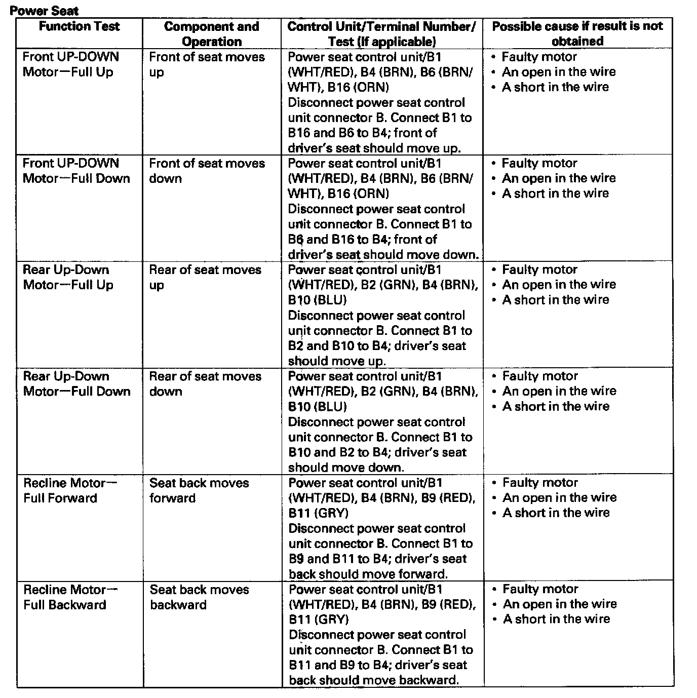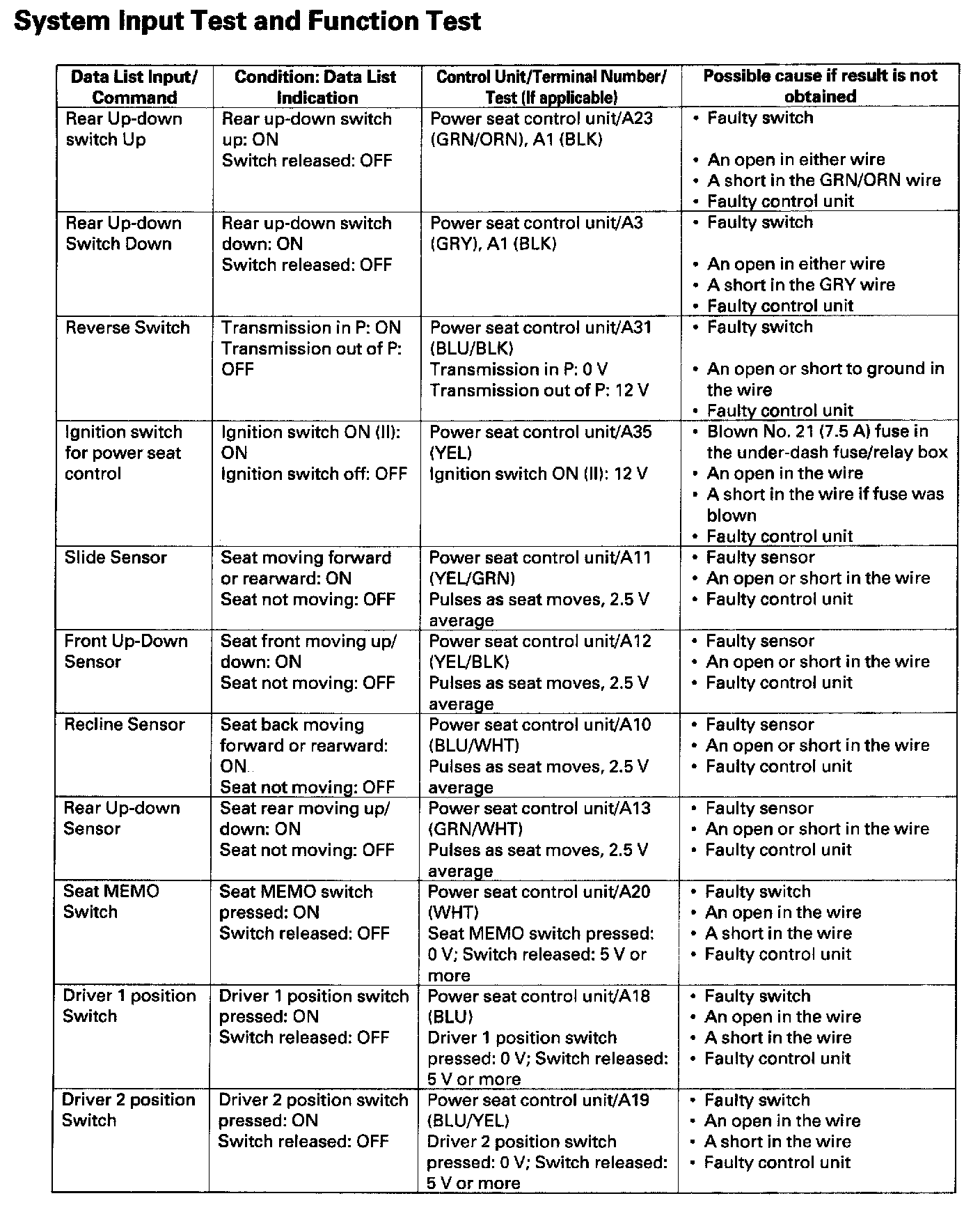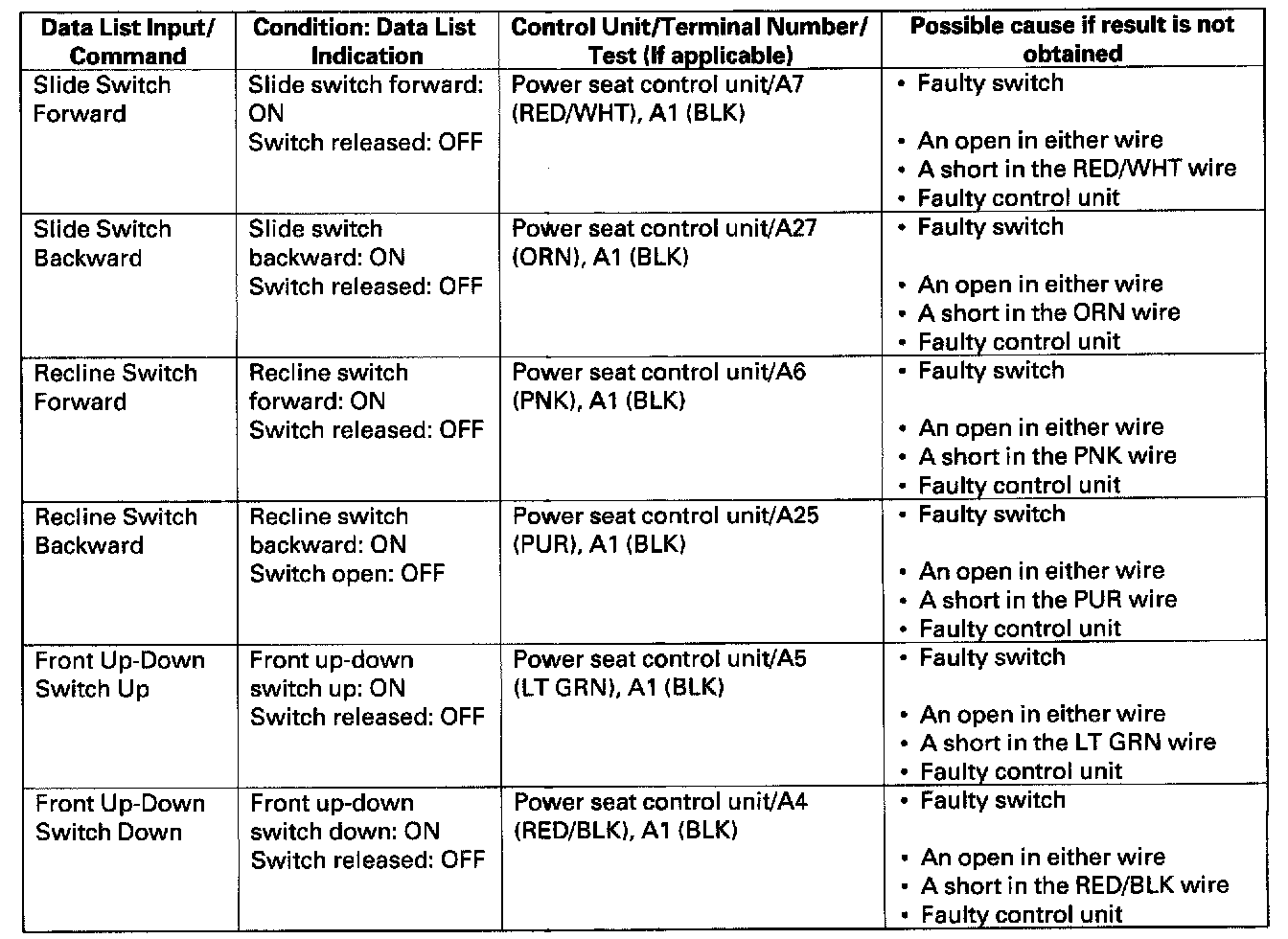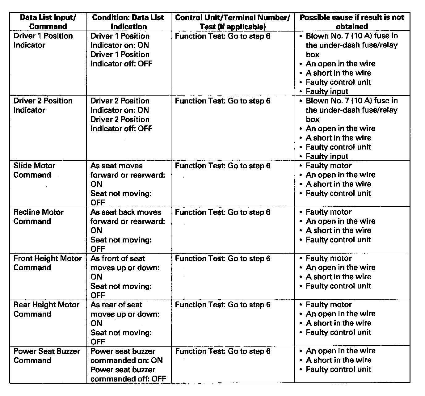 - If the function does not operate normally, perform the appropriate test at the control unit and terminal indicated in the table.