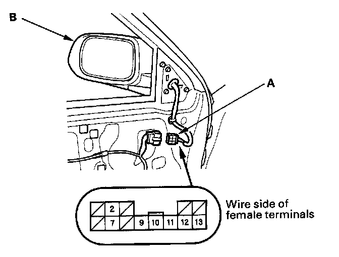 2. Disconnect the 13P connector (A) from the power mirror actuator (B).
