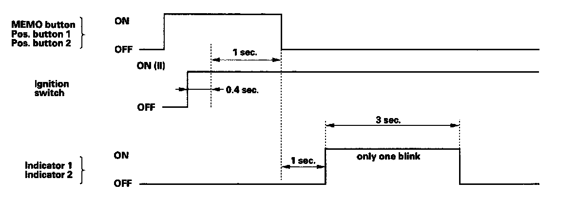 The self-diagnostic function of the driving position memory system detects system problems. If a system problem is detected, the buzzer built into the power seat control unit sounds for 5 seconds and the system stores a DTC. The status and DTC information can be retrieved through the driving position memory switch indicators.