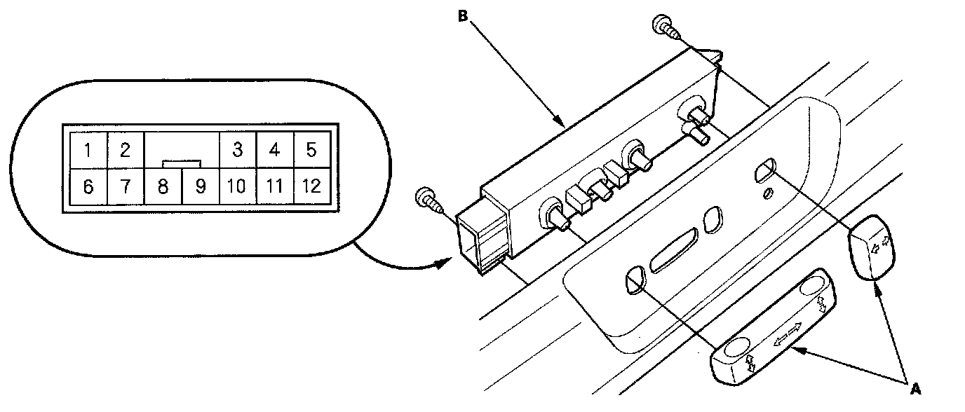 1. Remove the power seat adjustment switch knobs (A) and recline cover from the driver's power seat, then remove the two screws and the power seat adjustment switch.