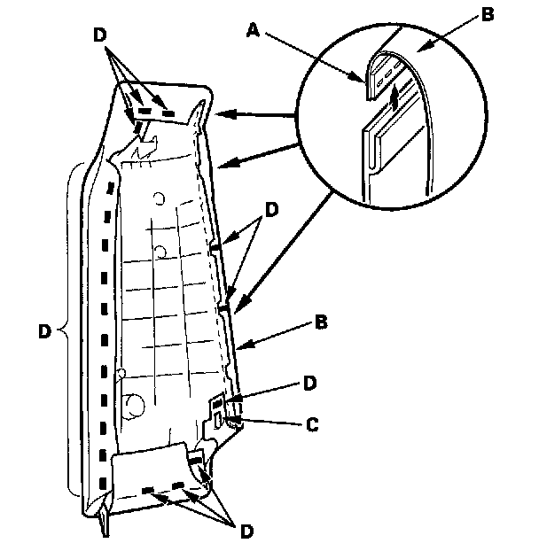 2. Release all the hook strips (A), and fold back the seat side bolster cover (B), and release the cover from the hook (C), and release the staples (D) fastening the cover, to remove it.
