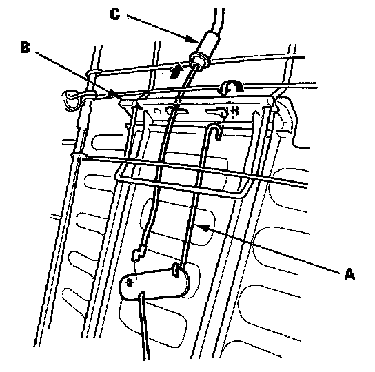 4. Release the hook of the yoke wire (A) from the top of the basket (B) to loosen the lumbar support cable (C), then disconnect it.