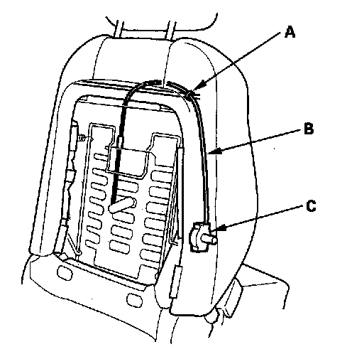 5. Release the wire tie (A), then remove the lumbar support cable (B) and actuator (C) as an assembly.
