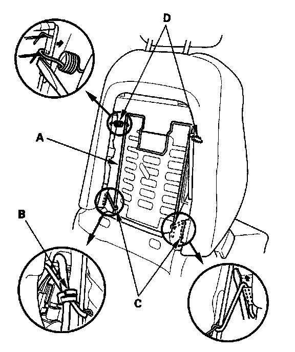 1. Release the clamp (B) fastening the recline motor harness to the lower spring (C).