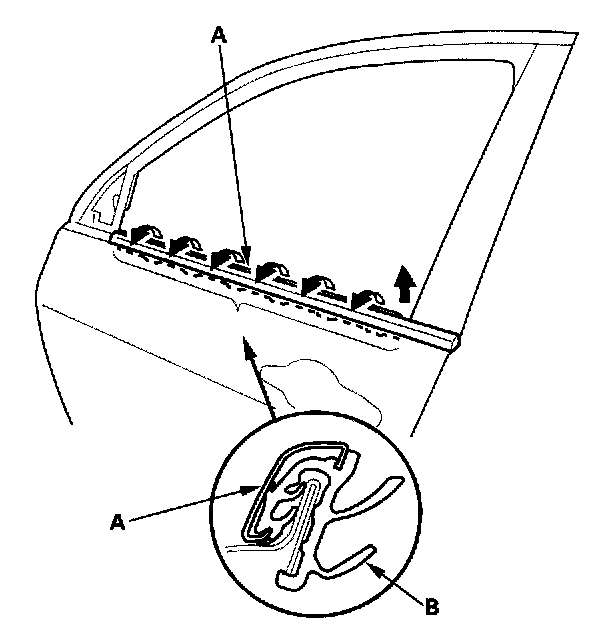 3. Starting at the rear, pull the door glass outer weatherstrip (A) up at each portion where the inner molding (B) catches the inside edge of the window slot, then remove the weatherstrip.
