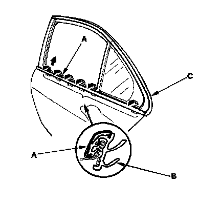 3. Starting at the front, pull the door glass outer weatherstrip (A) up at each portion where the inner molding (B) catches the inside edge of the window slot. Take care not to bend the door outer molding (C).