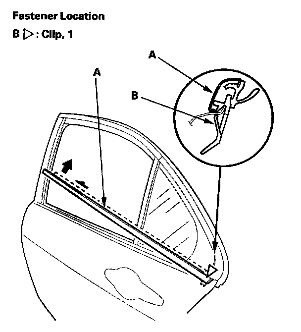 4. First slide the door glass outer weatherstrip (A) forward slightly, detach the rear clip (B) by pulling the front of the weatherstrip up, then remove the weatherstrip.