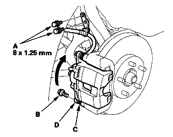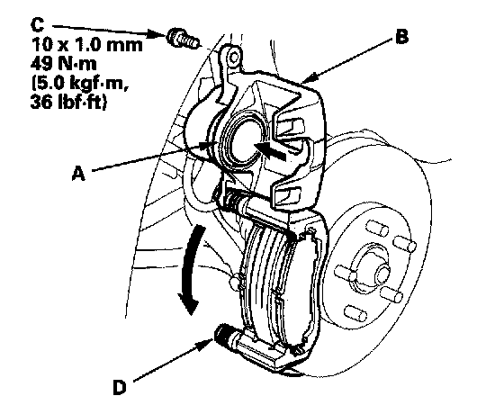 4. Remove the flange bolt (B) while holding the subpin (C) with a wrench being careful not to damage the pin boot, and pivot the caliper (D) up out of the way. Check the hose and pin boots for damage and deterioration.