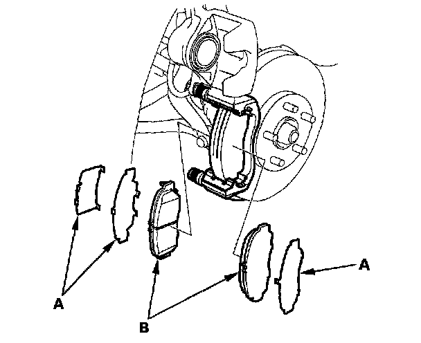 4. Check the thickness of the brake pads (A). Do not include the thickness of the brake pad backing plate (B).