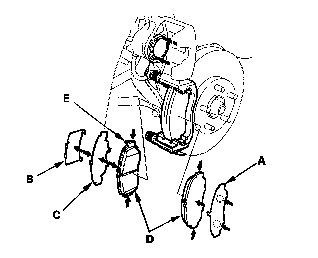 12. Install the brake pads and pad shims correctly. Install the pad with the wear indicator (E) on the inside.