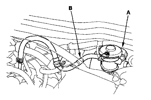3. Disconnect the brake booster vacuum hose at the booster (A). The check valve (B) is built into the hose.