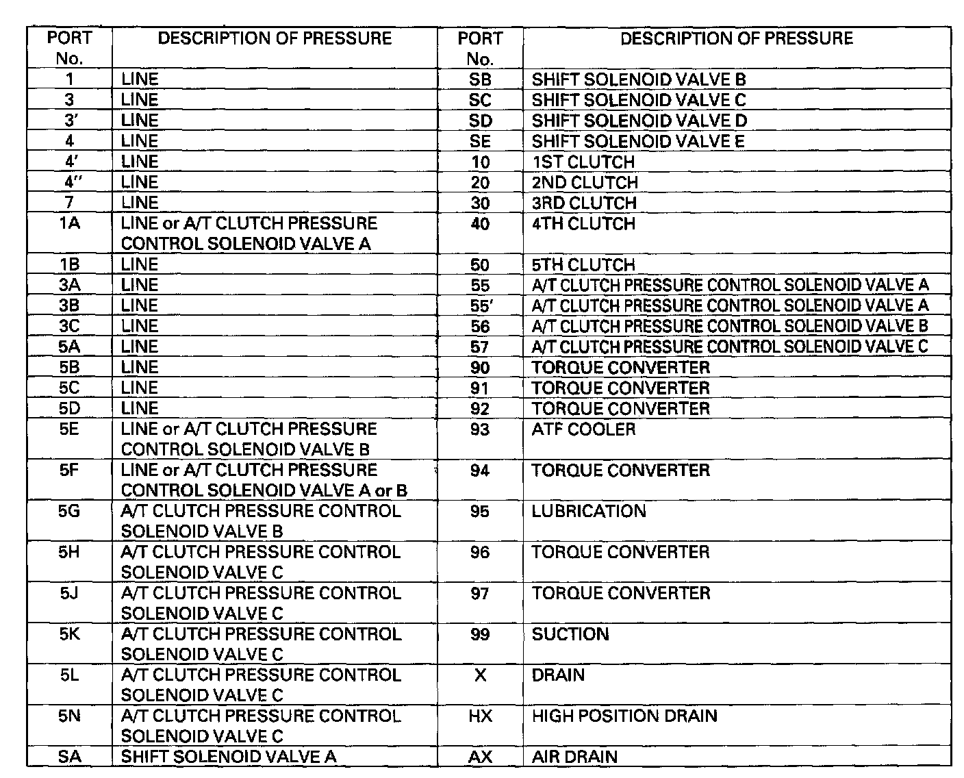 Line pressure (1) flows to the shift solenoid valves and A/T clutch pressure control solenoid valve A, and changes to A/T clutch pressure control solenoid valve A pressure (55) at A/T clutch pressure control solenoid valve A. A/T clutch pressure control solenoid valve A pressure (55) becomes line pressure (1 B) at shift valve A, and stops at the manual valve. Under this condition, hydraulic pressure is not applied to the clutches.