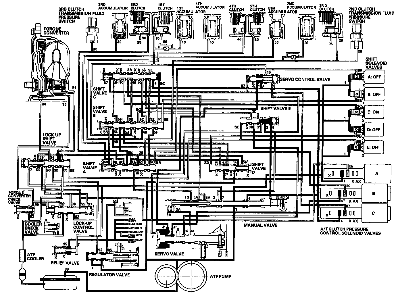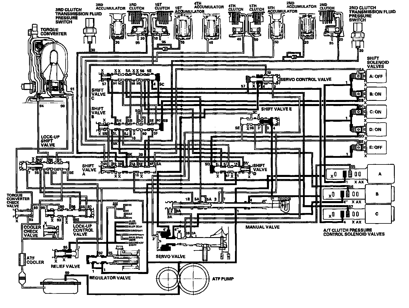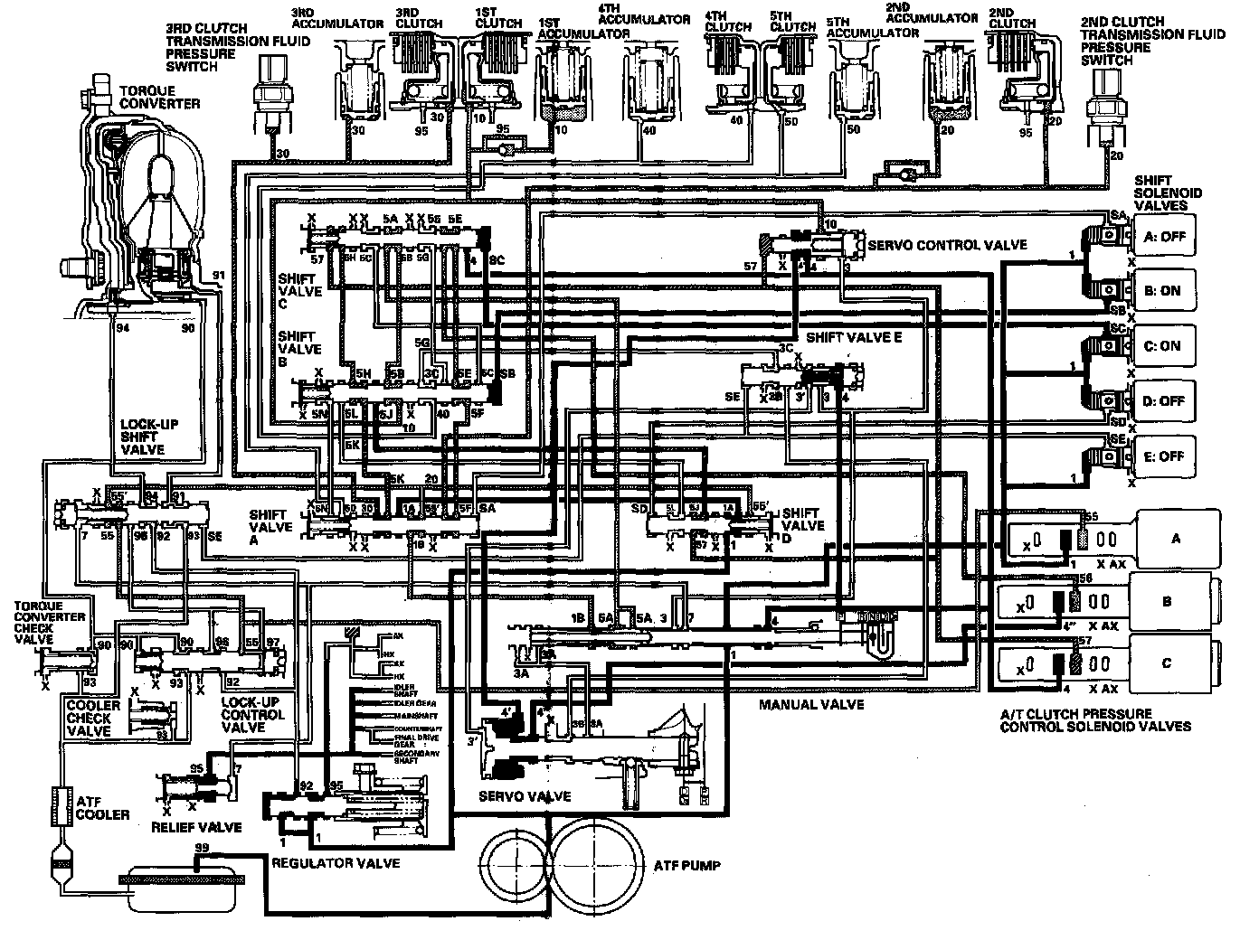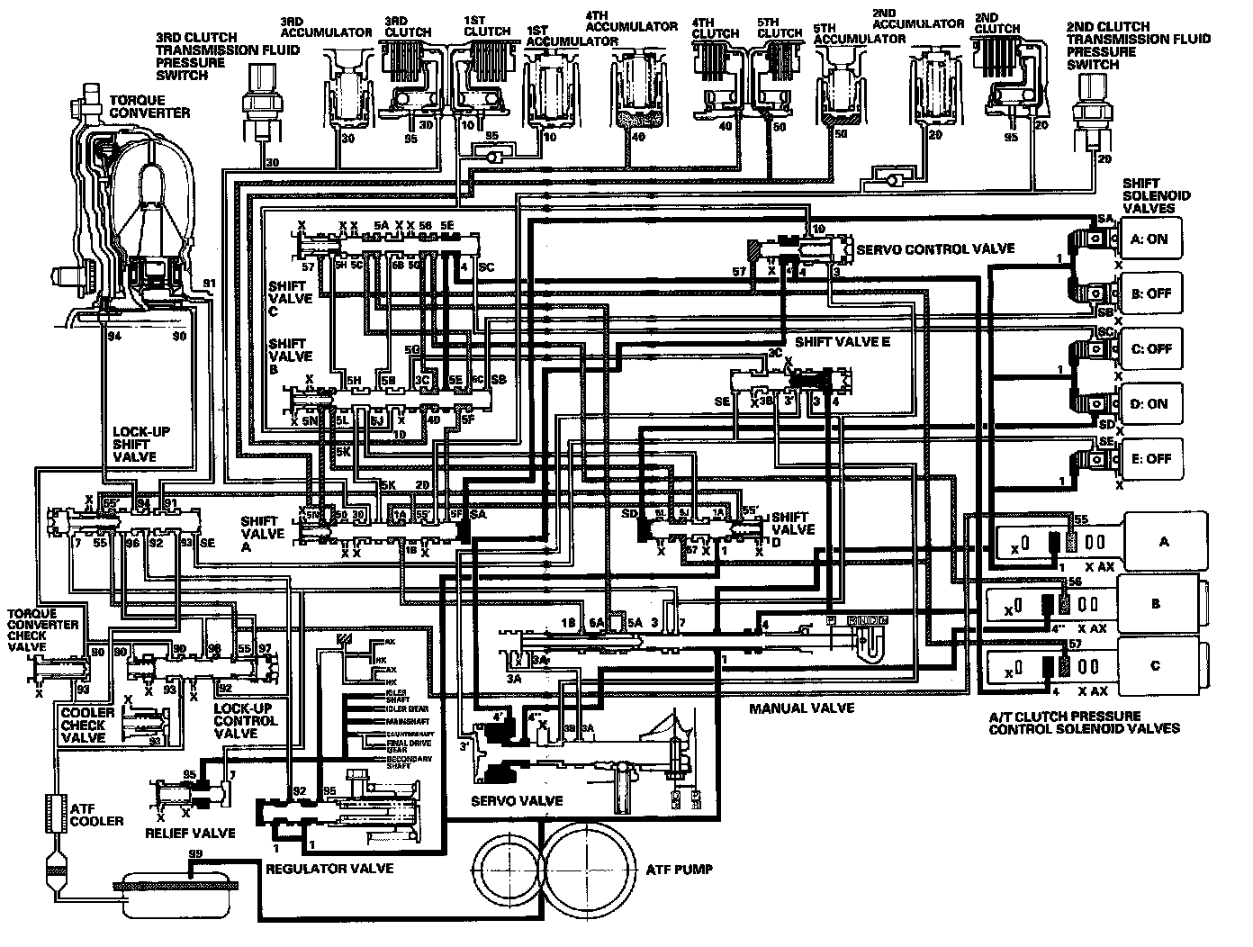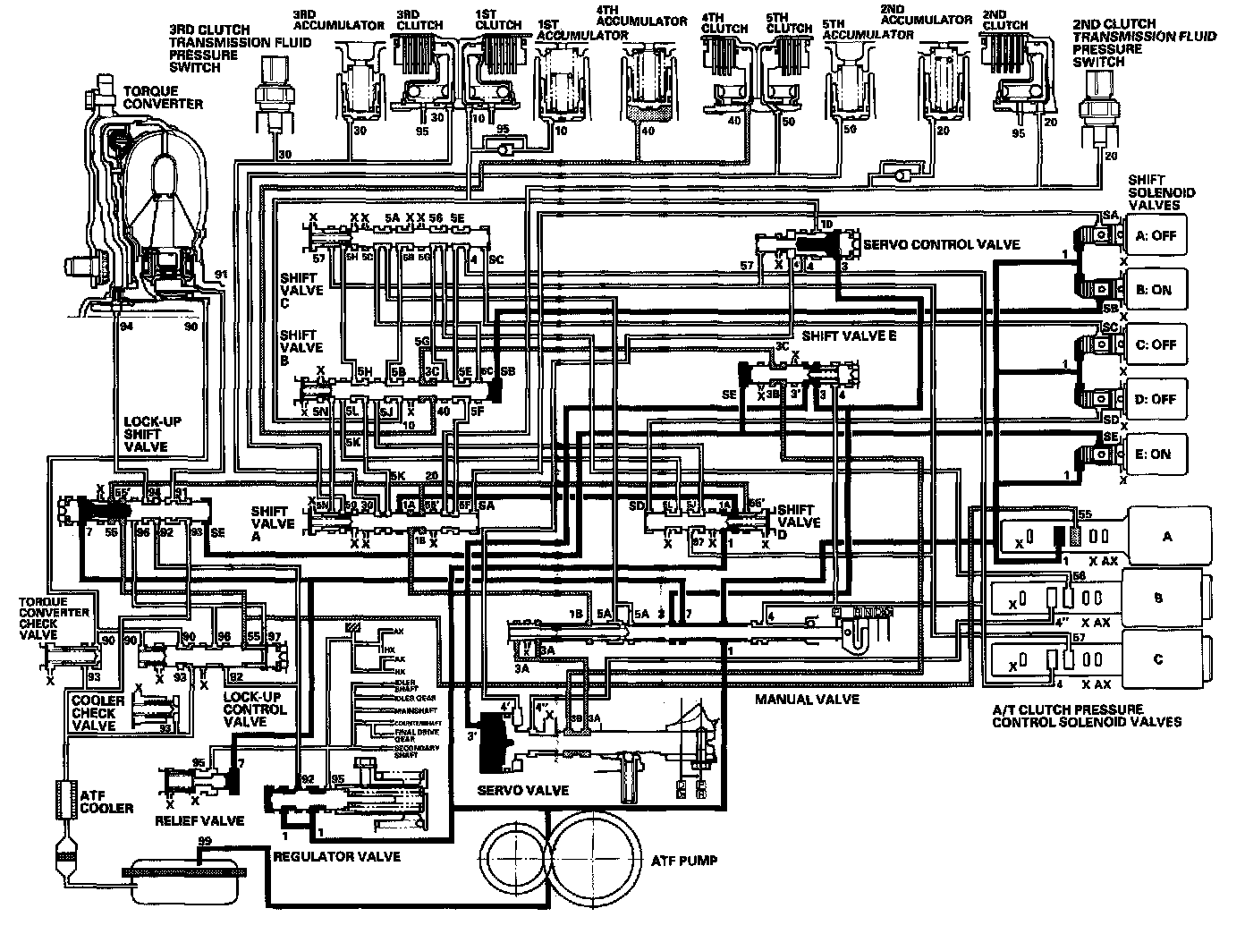 - Shift solenoid valve E: OFF Shift valve E stays on the left side