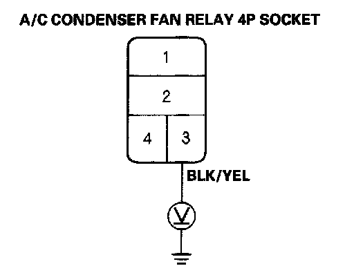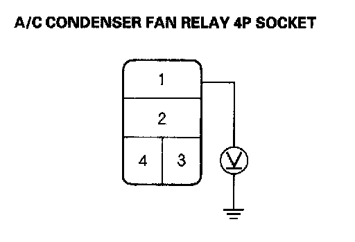 3. Measure the voltage between the No. 1 terminal of the A/C condenser fan relay 4P socket and body ground.