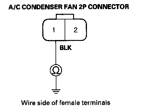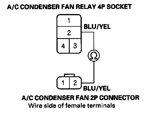 10. Check for continuity between the No. 2 terminal of the A/C condenser fan relay 4P socket and the No.:2 terminal of the A/C condenser fan 2P connector.
