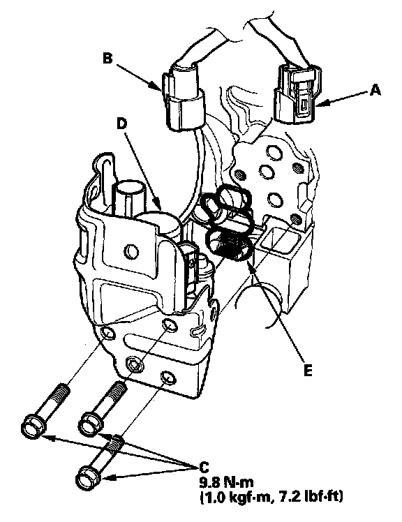 Rocker Arm Oil Control Valve (VTEC Solenoid Valve) Removal/Installation1. Disconnect the rocker arm oil control solenoid (VTEC solenoid valve) connector (A) and the rocker arm oil pressure switch (VTEC oil pressure switch) connector (B).