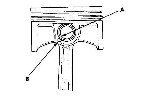 2. Apply engine oil to the piston pin snap rings (A), and turn them in the ring grooves until the end gaps are lined up with the cutouts in the piston pin bores (B).