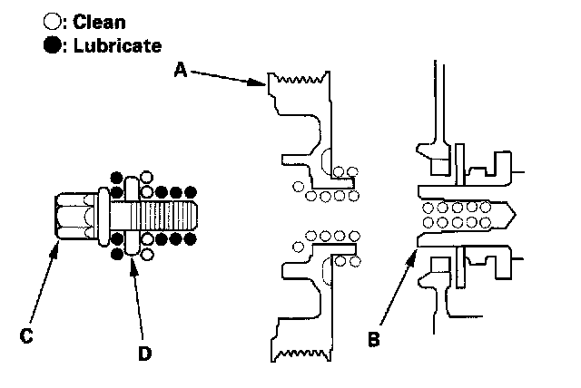 1. Clean the crankshaft pulley (A), crankshaft (B), bolt (C), and washer (D). Lubricate new engine oil as shown.