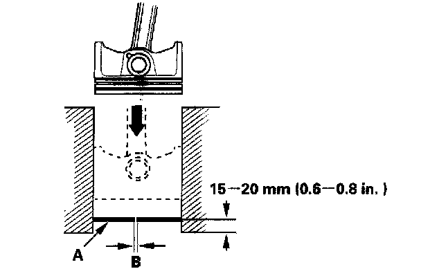 4. Using a piston, push a new ring (A) into the cylinder bore 15 - 20 mm (0.6 - 0.8 inch) from the bottom.