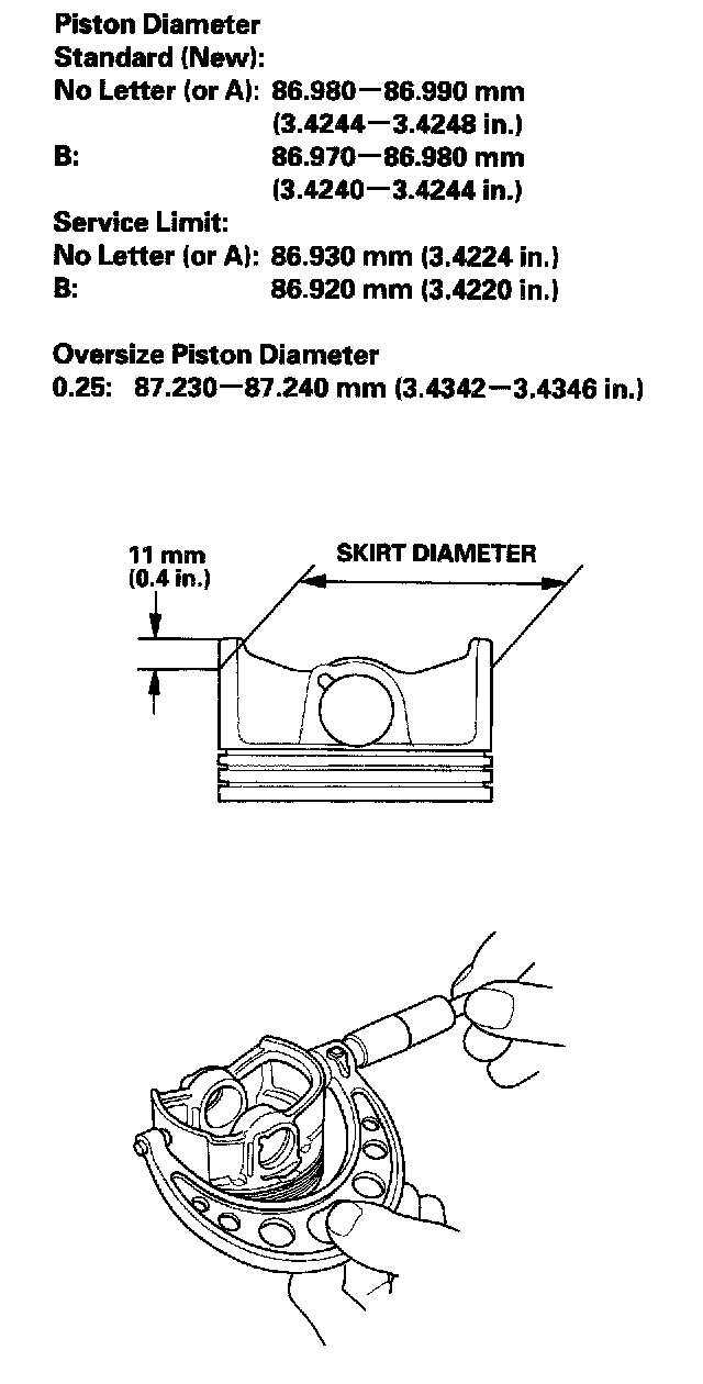 3. Measure the piston diameter at a point 11 mm (0.4 inch) from the bottom of the skirt. There are two standard-size pistons (No Letter or A, and B). The letter is stamped on the top of the piston. Letters are also stamped on the block as cylinder bore sizes.