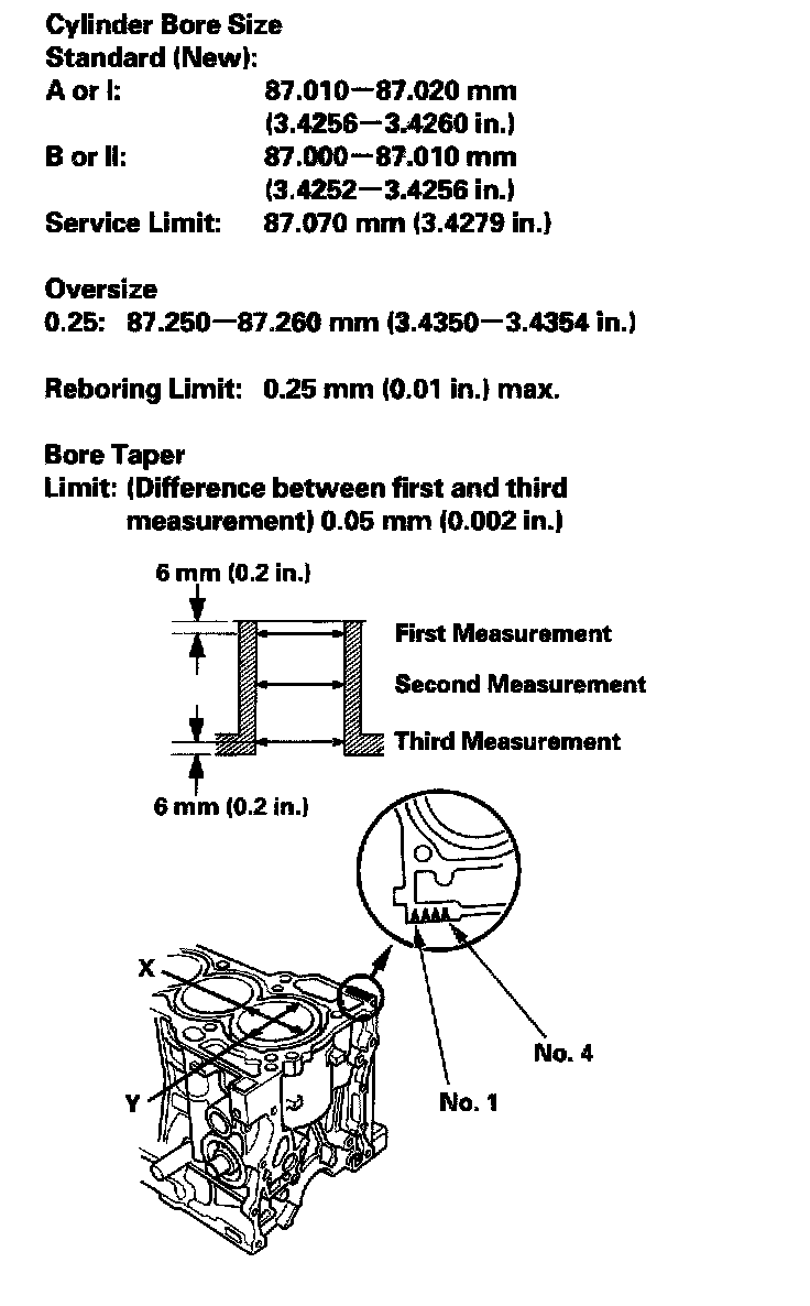 4. Measure wear and taper in direction X and Y at three levels in each cylinder as shown. If measurements in any cylinder are beyond the Oversize Bore Service Limit, replace the block. If the block is to be rebored, refer to step 7 after reboring.