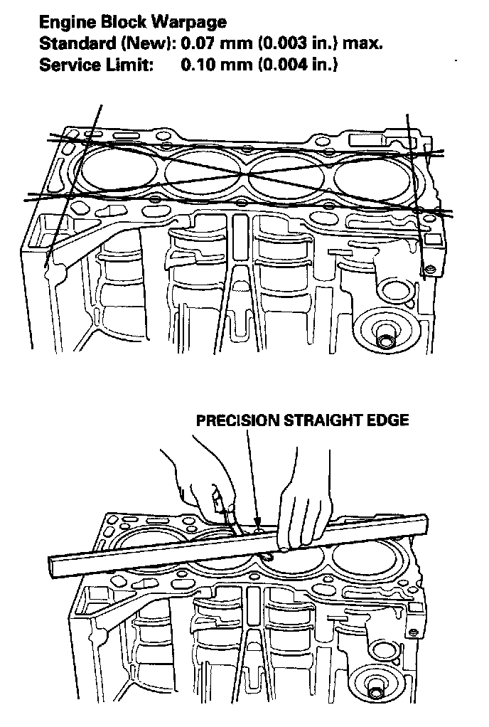 6. Check the top of the block for warpage. Measure along the edges and across the center as shown.