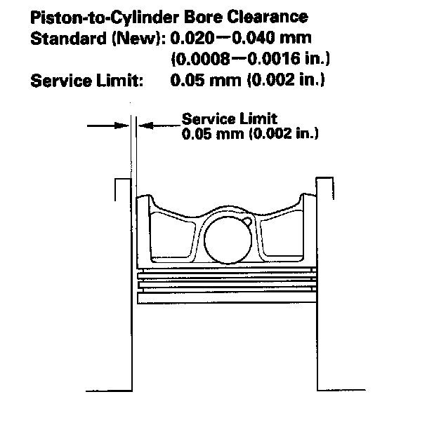 7. Calculate the difference between the cylinder bore diameter and the piston diameter. If the clearance is near or exceeds the service limit, inspect the piston and engine block for excessive wear.