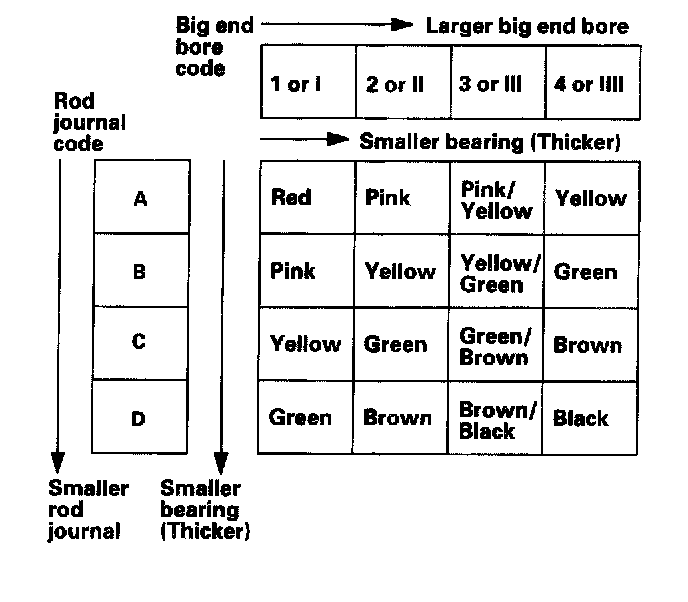 4. Use the big end bore codes and rod journal codes to select appropriate replacement bearings from the table.