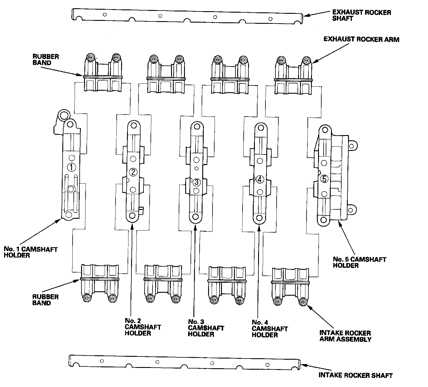 ^ When removing or installing the rocker arm assembly, do not remove the camshaft holder bolts. The bolts will keep the holders and rocker arms on the shaft.