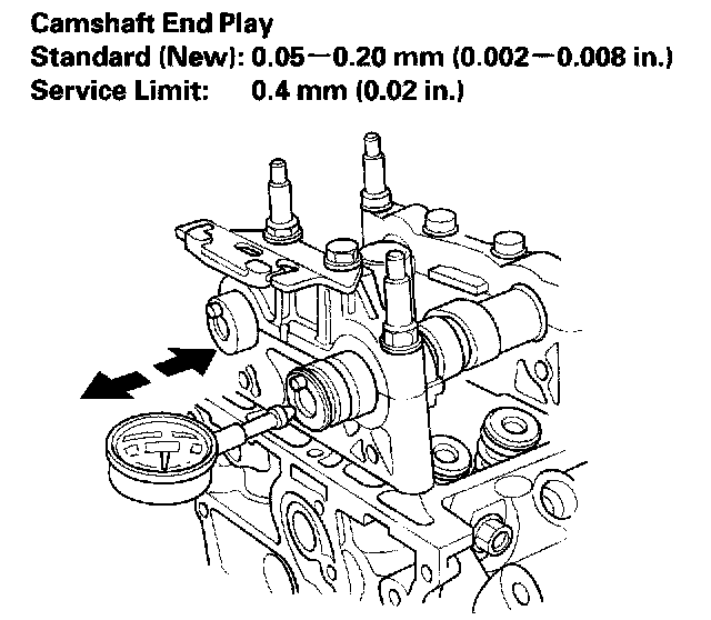 4. Zero the dial indicator against the end of the camshaft, then push the camshaft back and forth and read the end play. If the end play is beyond the service limit, replace the cylinder head and recheck.
