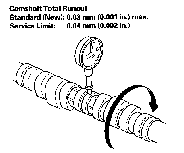 ^ If the total runout is beyond the service limit, replace the camshaft and recheck the camshaft to-holder oil clearance. If the oil clearance is still beyond the service limit, replace the cylinder head.