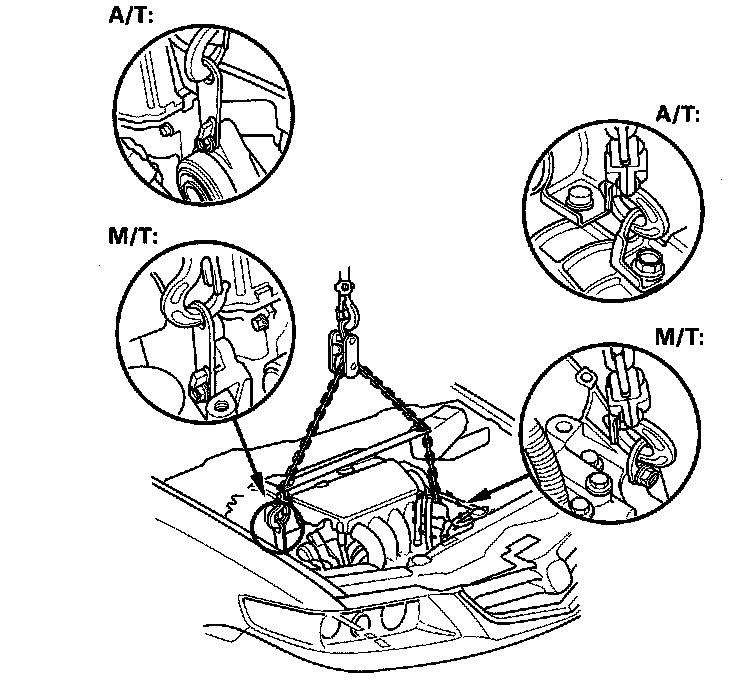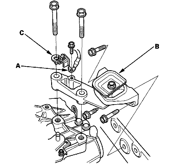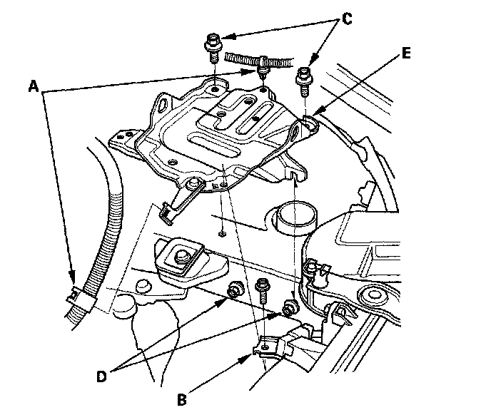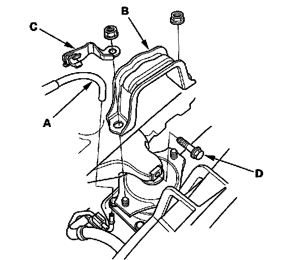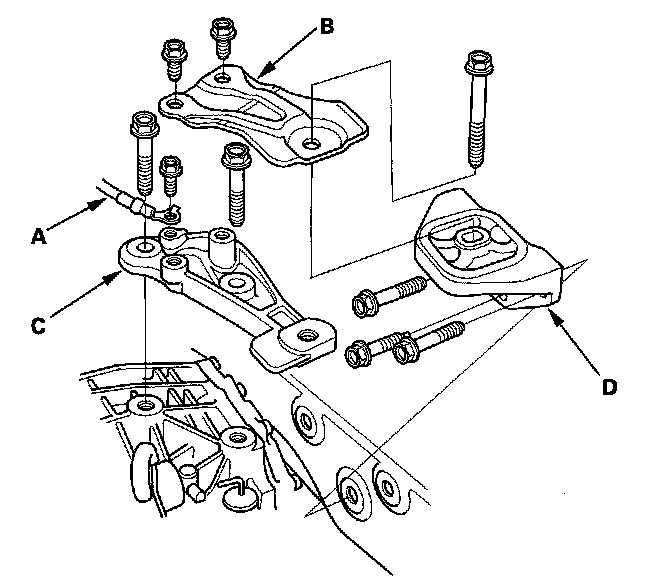 45. A/T Model: Remove the ground cable (A), then remove the bracket plate (B), transmission upper bracket (C), and transmission upper mount (D).